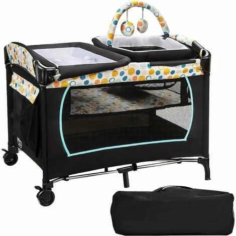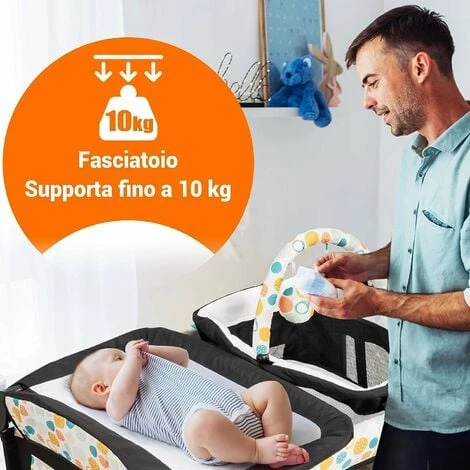 Centro attività multiuso per bambini: La combinazione tra fasciatoio, culla, lettino e centro attività accompagna il bambino nella crescita. Il fasciatoio è molto comodo per cambiare il pannolino, la culla è ideale per far dormire i bambini, il lettino ha un materasso spesso 1,5 cm e morbido al tatto e il box si può usare come centro attività per far giocare liberamente i bambini.