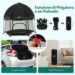 COSTWAY Box Per Bambini Con Tettuccio Rimovibile, Box Esagonale Pieghevole Con Borsa Di Trasporto, Tappetino, Centro Attività Per Bambini E Neonati, 134x132x132 Cm (Nero)