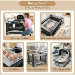 COSTWAY Culla Da Campeggio 5 In 1, Co-Sleeping AItezze Regolabili, Lettino Da Campeggio Con Fasciatoio, Box Bambini Pieghevole E Ingresso Laterale, Giocattolo Appeso, Ruote E Freni (Grigio)