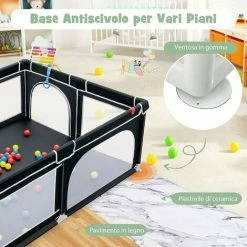 COSTWAY Box Per Bambini, Recinto Per Neonati, Box Per Interno Ed Esterno Con Palline, Con Cancelli Di Sicurezza, Con Ventose Antiscivolo, Pareti A Rete Traspirante E 4 Anelli Per Bambini (Nero)