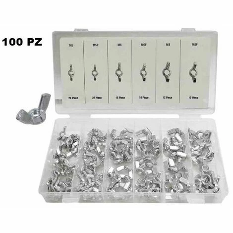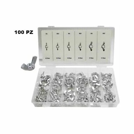 SET DI DADI A FARFALLAMISTI 100 PEZZI.SET DI DADI A FARFALLA IN ACCIAIO CROMATO IN BOX DA 100 PEZZI.MISURE:M5 — 22 PZ — M5F — 22 PZM6 — 16 PZ — M6F — 16 PZM8 — 12 PZ – M8F — 12 PZ