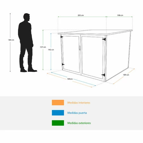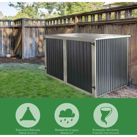 Un modo pratico per mantenere le biciclette organizzate e al riparo dalle intemperie in maniera sicura. Dal design semplice e funzionale, provvisto di rampa si possono riporre fino a 4 biciclette. Chiusura sicura: Con una chiave che blocca la parte superiore e inferiore della porta (chiavi incluse). Tetto a una falda, doppia porta, senza finestra per una maggior privacy. Fornito con la garanzia Gardiun. n nCaratteristiche: nMisure esterne: 198 (lunghezza) x 203 (larghezza) x 157 (altezza) cm nMisure interne: 189 x 189 cm nPeso: 65,5 Kg nMateriale: acciaio zincato nMisure della porta: 152 (lunghezza) x 195 (larghezza) cm nTipo di porta: doppia pieghevole nTipo di unione: viti, dadi e rondelle nColore: Antracite / Bianco nTetto: a una falda nPavimento: No nFinestra: No nSpazio consigliato: 210×220