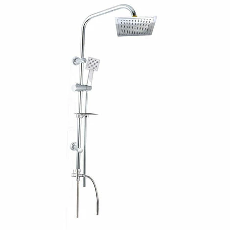 Colonna doccia con saliscendi dal design moderno ed essenziale in elegante acciaio cromato con sistema anticalcare Fornita soffione fisso quadrato, telefono doccia amovibile, 2 tubi flessibili, un comodo portasapone e viti per il fissaggio.