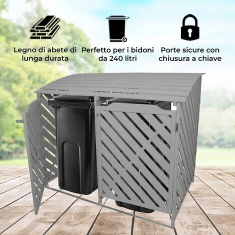 Realizzato con legno di abete douglas di alta qualità, il telaio a doghe permette all’aria di filtrare attraverso lo spazio, mantenendo un odore fresco nel vostro giardino. Il contenitore è progettato per contenere due bidoni standard da 240 litri, ma la sua versatilità lo rende adatto per riporre anche altri oggetti come la legna da ardere o gli attrezzi da giardino essenziali.