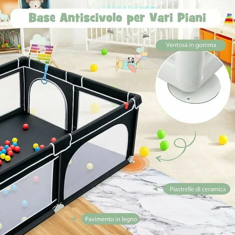 - Materiale Atossico e Base Stabile: Realizzato in tessuto Oxford di alta qualità, il nostro box per bambini è atossico e inodore. Utilizziamo ferro di alta qualità per rafforzare l’intera struttura. Inoltre, le 4 ventose in gomma antiscivolo nella parte inferiore fissano tutti i pannelli al loro posto.