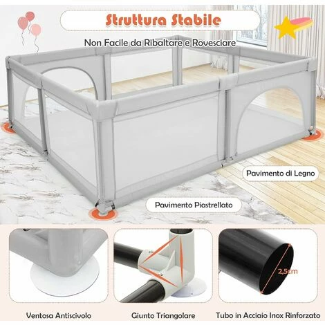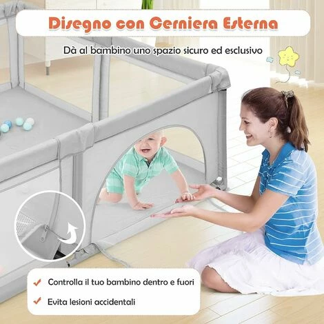 - Stai cercando un recinto di sicurezza per il tuo bambino? Questo box rettangolare sarà una scelta ideale per te. È realizzato in struttura di acciaio verniciato robusta. I connettori sono solidi e resistenti per una maggior stabilità e con i piedini a ventosa si fissano bene sul pavimento per l’utilizzo sicuro. Ci sono 2 portine ad arco in rete traspirante e sono anche facili da aprire e chiudere dall’esterno con la cerniera flessibile. Offre un centro di attività ai bambini per giocare dalla nascita. Grazie al design leggero, è facile da spostare. Compralo subito!
