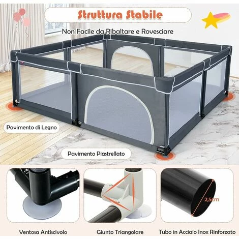 - Stai cercando un recinto di sicurezza per il tuo bambino? Questo box rettangolare sarà una scelta ideale per te. È realizzato in struttura di acciaio verniciato robusta. I connettori sono solidi e resistenti per una maggior stabilità e con i piedini a ventosa si fissano bene sul pavimento per l’utilizzo sicuro. Ci sono 2 portine ad arco in rete traspirante e sono anche facili da aprire e chiudere dall’esterno con la cerniera flessibile. Offre un centro di attività ai bambini per giocare dalla nascita. Grazie al design leggero, è facile da spostare. Compralo subito!