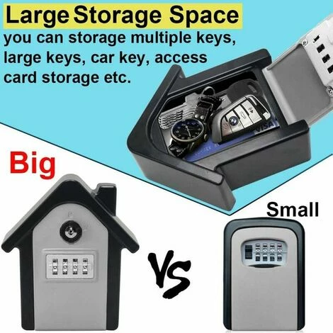 - Archiviazione ampia e sicura: La capacità della grande scatola per chiavi con codice è abbastanza grande (dimensione interna di circa 4,5 * 3,7 * 2 pollici) per mettere le chiavi di casa, ufficio o altre grandi chiavi dell’auto; E puoi anche memorizzare alcune piccole cose se necessario, come carte di credito, carte d’identità, ecc.