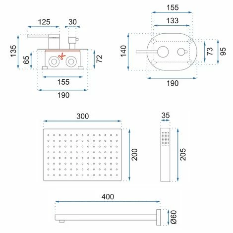 - Incluso: rubinetto da incasso, soffione doccia, braccio soffione doccia, Tubo 1500 mm, doccetta, supporto per doccetta, copertura